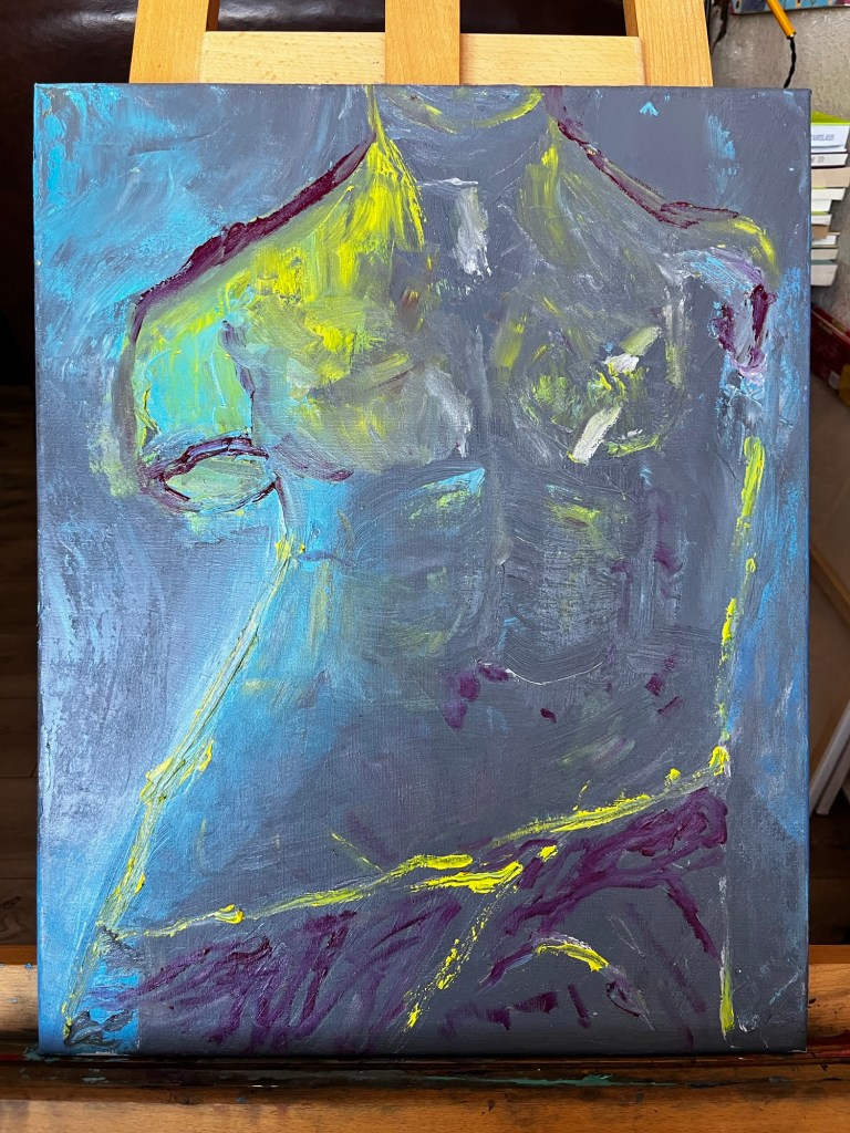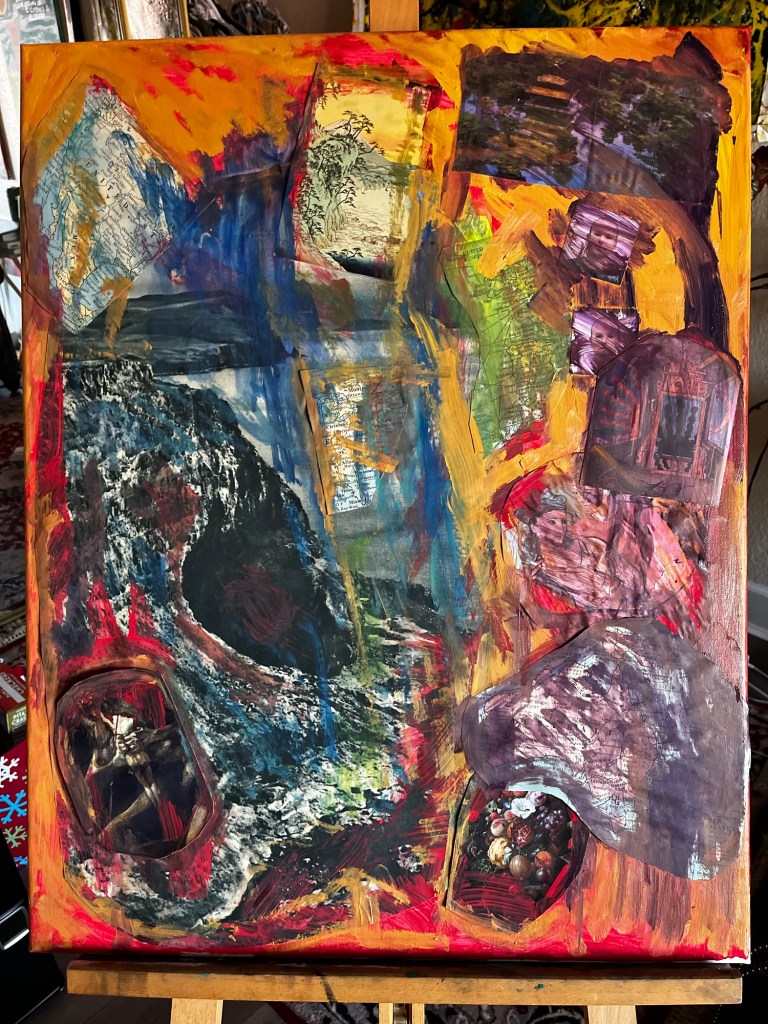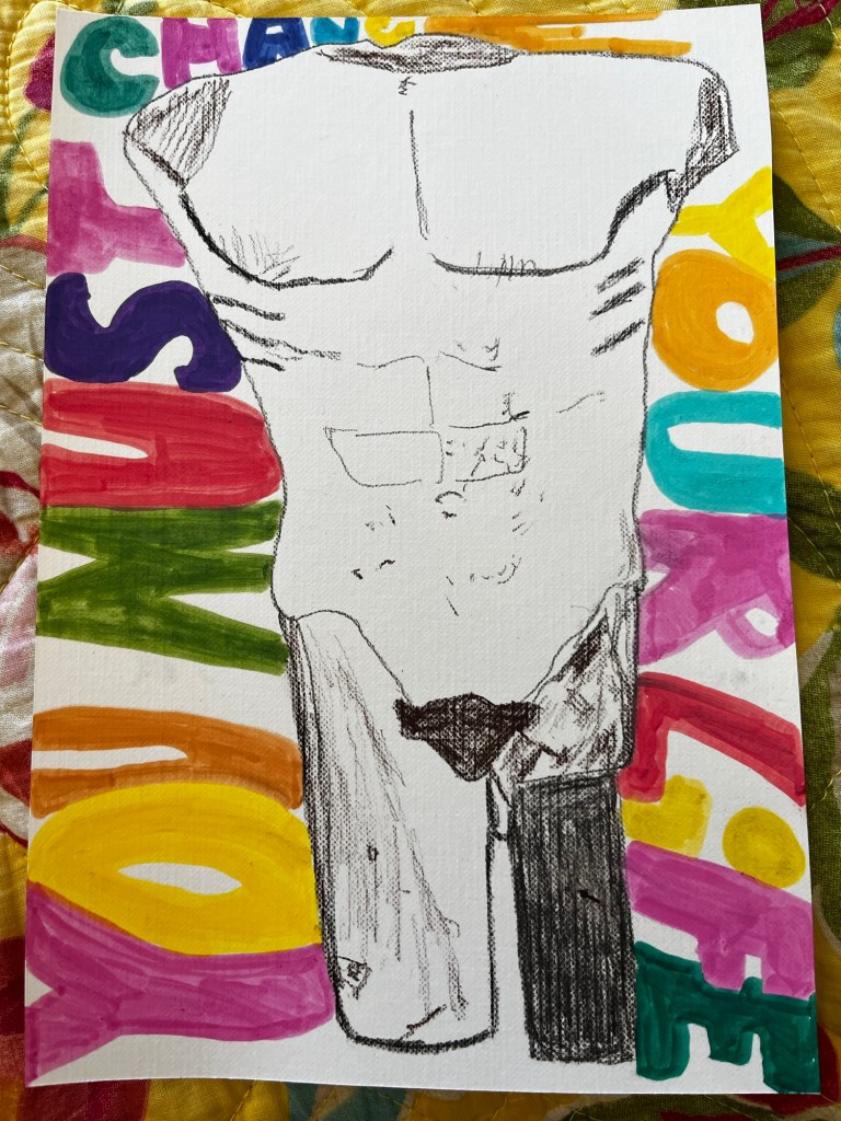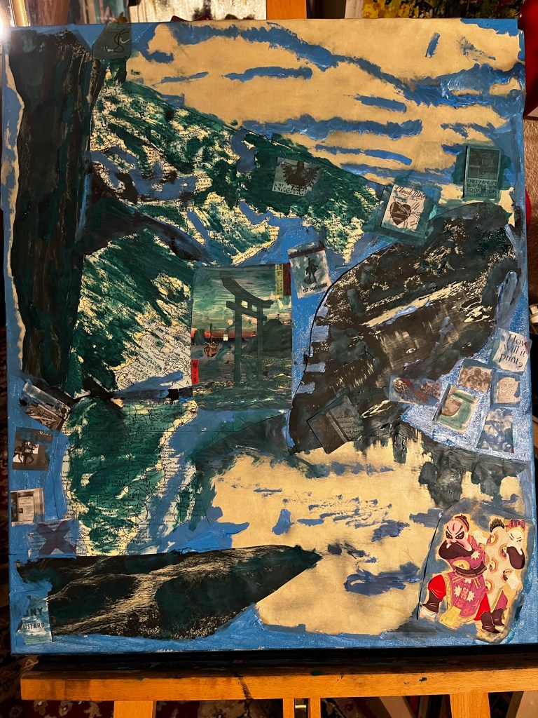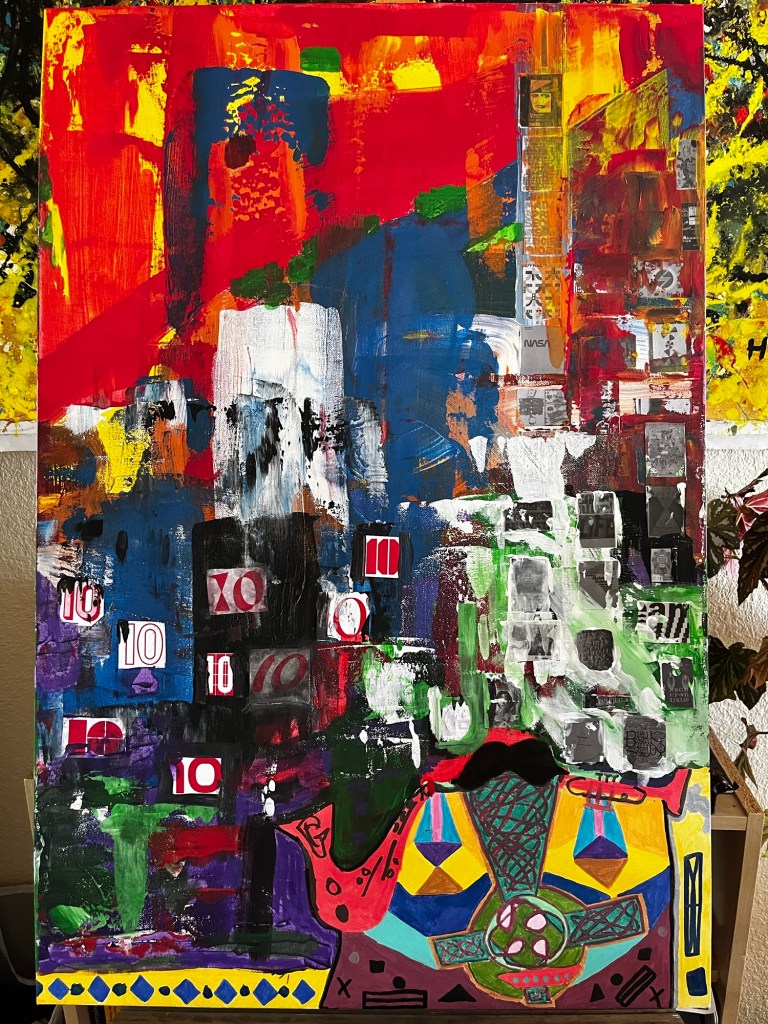 “He’s a 10,” 24″ x 36″ acrylic, acrylic marker, oil, collaged typography on canvas